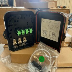Caja NAP 230x180x55: PC+ABS, negra, puerto sin corte; 8 enfrentadores SC/APC + 1 splitter 1:8 SC/APC