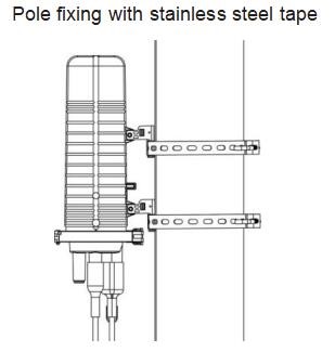 La caja contiene empalmes directos o derivados, que soportan hasta 96 fibras instaladas en el interior a través de bandejas de plástico. Tiene una configuración de entrada de cable unidireccional, con 1 entrada de cable Ovalada para cables de 10 a 25mm y 4 entradas de cable cilíndrico de 8 a 18mm de diámetro, selladas por tubos termocontractables. Fácil cierre mecánico entre la cúpula y la base a través de un conjunto de abrazaderas de plástico.